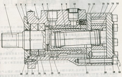 圖3所示的BM型馬達(dá),其輸出軸1通過傳動(dòng)銷22帶動(dòng)配流套7旋轉(zhuǎn),為防止產(chǎn)生對配流套偏歪,銷22不用剛性聯(lián)接而采用彈簧23將其推入配流套的鍵槽中,因而配流套在輸出軸內(nèi)可浮動(dòng),不受徑向力的影響。從而能保證配流套與殼體配合面的同心,可延長使用壽命。但因傳動(dòng)鏈加長了,需保證機(jī)件制造精度才不會(huì)使配流精度下降。