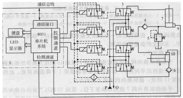 1-子控制器;2-先導(dǎo)電磁換向閥; 3-液動(dòng)換向主閥;4、6-單向閥;5-溢流閥 7- 立柱液壓缸;8-推移液壓缸;9-壓力傳感器;10-位移傳感器