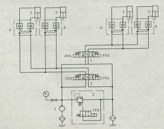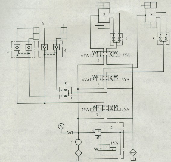 該公路架橋機共有三套獨立的液壓系統(tǒng):1號柱、2號柱各用一套液壓系統(tǒng),液壓原理圖如圖6-27所示;0號柱和3號柱合用一套液壓系統(tǒng),液壓原理圖如圖6-28所示。