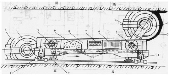 現(xiàn)代綜合機(jī)械化長壁采煤工作面上大都采用滾筒式采煤機(jī)采煤。其外形結(jié)構(gòu)如圖4.8-4所示。圖中,3為搖臂,4為擋煤板,5為切割部減速箱,6為電動機(jī),7為控制箱,8為液壓牽引部,10為調(diào)高液壓缸,11為調(diào)料液壓缸。在割煤滾筒1的螺旋形葉片上裝有截齒,當(dāng)滾筒在煤壁內(nèi)旋轉(zhuǎn)時(shí),便可將煤切下,并裝入工作面刮板輸送機(jī)2的溜槽中運(yùn)走。采煤機(jī)騎在輸送機(jī)的槽幫上。沿工作面全長有一條張緊的牽引錨鏈,它與采煤機(jī)牽引部的牽引鏈輪9相嚙合,鏈輪轉(zhuǎn)動,就牽引著采煤機(jī)沿煤壁往復(fù)運(yùn)動,連續(xù)采煤。