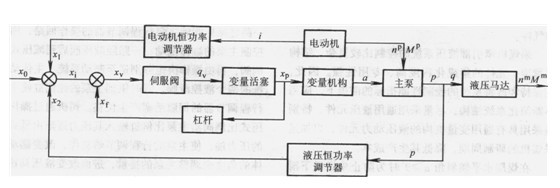 液壓恒功率調(diào)節(jié)器17由裝在開關(guān)活塞16中的一個(gè)小柱塞17.1和平衡彈簧17.2構(gòu)成。小柱塞一端與系統(tǒng)的高壓側(cè)相通,所受的液壓力與彈簧力始終相平衡。故小柱塞的伸出距離x1與系統(tǒng)的液壓力成正比,它實(shí)際上就是系統(tǒng)的壓力反饋測量裝置;電動機(jī)恒功率調(diào)節(jié)器18包括一個(gè)行程可調(diào)的小活塞和一個(gè)三位四通電磁閥18.2。這兩個(gè)調(diào)節(jié)器的柱塞軸線和油塞軸線在同一直線上,并與主泵的零位相對應(yīng)。電磁閥18.1由電流反饋系統(tǒng)測得的電流信號控制,是一個(gè)具有死區(qū)的繼電器型非線性控制環(huán)節(jié)。小活塞的外伸距離為z:。此系統(tǒng)主要環(huán)節(jié)的方框圖如圖4.8-6所示。圖中xo為給定位移,x1為液壓恒功率調(diào)節(jié)器的位移,X2為電機(jī)恒功率調(diào)節(jié)器的位移,xi=xo-x1-x2,xf為反饋杠桿位移,xv= xi -xf,qv為伺服閥流量,xp為變量活塞位移,α為變量機(jī)構(gòu)轉(zhuǎn)角,np、Mp為泵輸入的轉(zhuǎn)速和力矩,p、q為泵輸出的壓力和流量,nm、Mm為液壓馬達(dá)輸出的轉(zhuǎn)速和力矩,i為電動機(jī)恒功率調(diào)節(jié)器的控制電流。