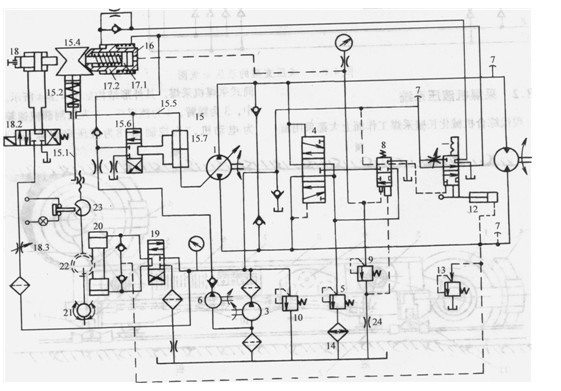 采煤機(jī)的液壓系統(tǒng)見圖4.8-5。主泵1為具有恒功率變量機(jī)構(gòu)的斜軸式軸向柱塞泵,馬達(dá)2為與主泵同規(guī)格的斜軸式定量柱塞馬達(dá)。