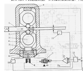 板坯料從旋轉(zhuǎn)著的上、下工作輥2所形成的輥縫中連續(xù)穿過,在軋制力的作用下板帶被軋薄,經(jīng)多道次軋制后可達(dá)到所需成品的厚度。為了軋制薄板帶,工作輥2(與板帶直接接觸的軋輥)的直徑必須減小,但軋制力將使工作輥彎曲變形,為此,在工作輥上下兩側(cè)裝有大直徑的支承輥3以阻止工作輥?zhàn)冃?。在軋制過程中對(duì)軋輥施以軋制力的機(jī)構(gòu)稱為壓下裝置。被軋板帶l從上、下工作輥2所形成的初始輥縫中穿過。上、下兩組工作輥和支承輥3支持在上、下軸承座4上。上、下軸承座裝在前、后兩側(cè)機(jī)架5內(nèi)(圖示為移去前側(cè)機(jī)架后的示意圖),上軸承座壓在測(cè)壓頭9上,下軸承座的位置由壓下液壓缸6控制。假如軋機(jī)的機(jī)架、軋輥、軸承座等傳力系統(tǒng)都是絕對(duì)剛體,那么由壓下液壓缸調(diào)定的初始輥縫值Su也就是軋制成品的厚度h。實(shí)際上由于被軋鋼板有很大的塑性變形,軋機(jī)傳力系統(tǒng)都是彈性體,因此,在初始輥縫給定條件下,板帶一經(jīng)穿入,整個(gè)傳力的彈性系統(tǒng)就會(huì)變形使輥縫變大,成品厚度h也變大。此外,在軋制過程中由于板帶坯料厚度和材料變形抗力的變化以及傳力系統(tǒng)幾何形狀的變化(如軋輥的偏心)等因素的影響,也會(huì)使板帶成品厚度發(fā)生變化。為了軋制出等厚度的板帶,壓下液壓缸不僅應(yīng)能調(diào)節(jié)空載時(shí)初始輥縫的大小,而且在軋制過程中其實(shí)際壓下量還必須隨時(shí)調(diào)整,以補(bǔ)償軋機(jī)傳力系統(tǒng)的彈性變化量(也稱為軋機(jī)的彈跳)的影響??梢?,板帶軋鋼機(jī)的液壓壓下系統(tǒng)是在軋制過程中保證板帶沿縱向能有等厚度的自動(dòng)控制系統(tǒng)。壓下液壓缸6由電渡伺服閥7進(jìn)行控制,壓下液壓缸的位移(反映初始輥縫的大?。┯晌灰苽鞲衅?/span>8檢測(cè)。軋機(jī)的彈跳量決定于軋制力的大小,為此在軋機(jī)的l軸承座上裝有測(cè)壓頭9,檢測(cè)軋制力的變化,考慮軋機(jī)剛度后即可感受出彈跳量的大小?;蛴脡毫鞲衅?/span>10測(cè)出壓下液壓缸前后壓差的變化,也可感受出彈跳量的大小。板帶出口的實(shí)際厚度h用測(cè)厚儀1l檢測(cè)。將位移傳感器、測(cè)厚儀、測(cè)壓頭(或壓力傳感器)經(jīng)過剛度調(diào)節(jié)器13處理后的信號(hào)輸入伺服放大器12,其輸出送至電液伺服閥以完成板帶的等厚度控制。其控制方框圖如圖 2所示。測(cè)厚儀測(cè)得的出口板厚h與板厚給定值ho進(jìn)行比較,產(chǎn)生厚度偏差調(diào)節(jié)量,考慮了在彈性傳力系統(tǒng)中板厚和輥縫之間的關(guān)系(用板厚一輥縫系數(shù)表示)后得到初