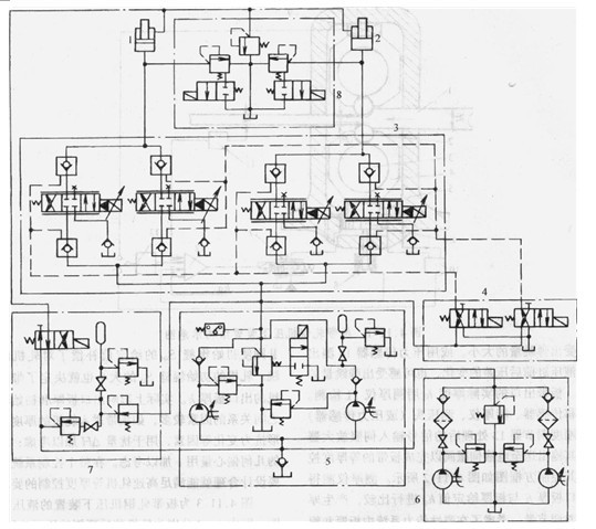 圖 3為板帶軋鋼機(jī)壓下裝置的液壓系統(tǒng)圖。圖中1、2分別為軋機(jī)前后兩側(cè)的壓下液壓缸。液壓缸無杠腔靠伺服單元3控制。每個(gè)壓下液壓缸由兩個(gè)并聯(lián)電液伺服蒯采用下述方式進(jìn)行控制:在一個(gè)電液伺服閥的控制電路中加入△%的死區(qū);另一則無死區(qū),這樣,當(dāng)控制信號(hào)小于死區(qū)范圍時(shí)只有一臺(tái)伺服閥工作,系統(tǒng)的增益較小容易穩(wěn)定;當(dāng)控制信號(hào)大于死區(qū)范圍時(shí)兩臺(tái)伺服閥同時(shí)工作,系統(tǒng)增益較大有利于快速調(diào)節(jié)。轉(zhuǎn)換油路單元4可對(duì)四個(gè)電液伺服閥前后的八個(gè)液控單向閥進(jìn)行操縱,可使電液伺服閥從系統(tǒng)中切除或投入。電液伺服閥由高壓油源單元5供油,單元中的蓄能器用以減少供油壓力的波動(dòng)。高壓油源單元在正常工作情況下由低壓油源單元6供油,在單元中有精過濾器。由于高壓液壓泵吸入的是加壓后的精濾油,這樣就提高了工作可靠性和壽命。壓下液壓缸有桿腔是由回程油路單元7供油,正常工作時(shí)Ff低壓油路單元6直接供油,軋機(jī)的輥縫開啟時(shí)經(jīng)減壓后供給較高壓力的液壓油。8為保護(hù)單元,對(duì)壓下液壓缸的有桿腔和無桿腔進(jìn)行過載保護(hù)。
