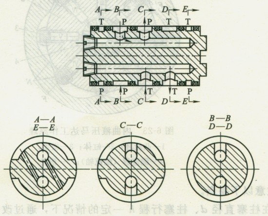 ③配流副。圖1所示馬達(dá)為軸配流。由于配流軸的一側(cè)為高壓腔,另一側(cè)為低壓腔,故配流軸工作過(guò)程受到很大的徑向力,此徑向力將配流軸推向一側(cè),而使另一側(cè)間隙加大,造成滑動(dòng)表面的磨損和泄漏量的增加,致使效率下降。為此,常采取開(kāi)設(shè)對(duì)稱(chēng)平衡油槽的措施以平衡徑向力。例如圖1所示為采用密封環(huán)密封的靜壓平衡配流軸的原理,C-C窗口是配流窗孔,B-B和D-D上的環(huán)形槽分別是進(jìn)油和回油窗孔,A-A和E-E是靜壓平衡半圓環(huán)形槽。假定各密封環(huán)分別放置在密封帶的正中。若進(jìn)、出油方向如圖中箭頭所示,各孔標(biāo)有符號(hào)P的都是高壓腔,標(biāo)有符號(hào)T的都是低壓腔??梢?jiàn),B-B和D-D圓周方向的壓力都相同,沒(méi)有徑向力產(chǎn)生;C-C窗孔剖面的上腔與進(jìn)油口相通,是高壓側(cè),下腔與回油相通,是低壓側(cè),因此使配流軸受到很大的徑向力。為了平衡這個(gè)徑向力,在配流軸兩端設(shè)置半圓平衡油槽A-A和E-E,使其上腔通高壓油,為了減小泄漏,各腔之間設(shè)有密封環(huán)。為了保證上、下兩側(cè)靜壓平衡,配流窗口和平衡油槽的相關(guān)尺寸應(yīng)滿(mǎn)足如下關(guān)系式