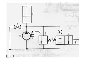 液壓泵2由發(fā)動機驅(qū)動,當電磁閥6失電時,閥關閉,來自泵2的油不經(jīng)過閥3直接進入舉升缸4,并使舉升缸4中活塞桿伸出,頂車廂升起卸貨。缸4也隨舉升過程而變得傾斜。當開關閥3打開時,來自泵2的油通過閥3回油箱1,車廂靠自重下降,舉升缸排出的油也經(jīng)過閥3與油箱相通。