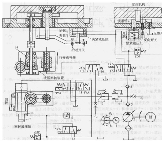 當(dāng)壓力油進(jìn)入夾緊液壓缸上腔,使活塞剛開始向下移動時,放開抬起時壓下的行程開關(guān),使電磁鐵4YA—5YA斷電,2YA通電,換向閥11處于中問位置,換向閥換向。壓力油經(jīng)換向閥10進(jìn)入離合器14的液壓缸,將離合器打開,為回轉(zhuǎn)液壓缸齒條活塞返回做好準(zhǔn)備。