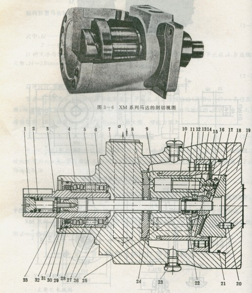 軸套3由雙列調(diào)心軸承4,滾子軸承6,內(nèi)、外隔圈28.27和卡環(huán)26聯(lián)結(jié)成一體,被支承于馬達(dá)殼體7內(nèi),并由油封壓蓋30、孔用卡環(huán)32軸向定位。這種傳動(dòng)軸與軸套組合式的結(jié)構(gòu),使得外負(fù)載對(duì)軸套3可能產(chǎn)生的橫向力矩由軸承和殼體來(lái)承擔(dān),而不會(huì)傳遞給軸5,故不致影響泵內(nèi)缸體9等精密零件的運(yùn)轉(zhuǎn)。